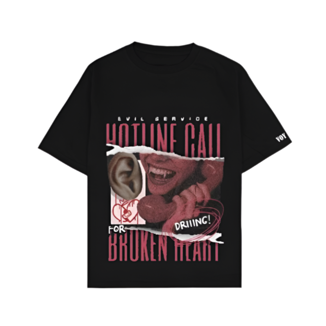 This is a black graphic T-shirt featuring a bold and edgy design. The front print includes a collage-style artwork with a mix of text and images, including a torn-paper effect, an ear, a smiling mouth on a phone, and red typography. The text reads "Evil Service: Hotline Call for Broken Heart", giving it a dark, vintage aesthetic. The distressed, grunge-inspired design makes it a standout piece for streetwear lovers.